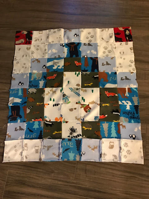 So, each time Hugo would outgrow his pjs, I would cut them in squares and tuck them away in the craft/office room until I thought there were enough to make a Hugo-sized blankie. This was my first time ever making a quilt. I just arranged a pattern that I thought would be pleasing and then sewed the squares together in a row. After all the rows were completed, I would then attach the rows together. Since this was done over time, I can tell when I was more tired on some days because my lines weren't as straight as I would like. It's a true story that whenever I am tired, lines will kind of take on their own life.